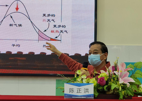 陈正洪教授从气候变化事实、气候变化的影响、气候变化归因及未来预测、气候变化与古迹遗址保护、当代青少年能做什么这五个内容展开,通过图文结合、举例子、列数据等多种方式为同学们较为系统介绍了国内外关于气候变化事实、气候变化对生态系统、近海、农业、健康、经济、居住地等方方面面的影响、气候变化归因及未来气候变化情景预估等方面的最新成果。