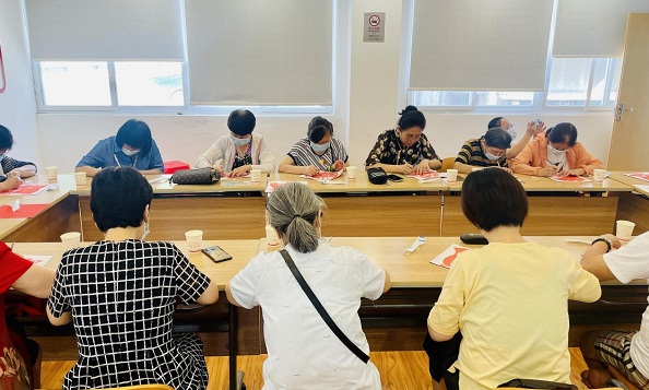 剪纸环节,老师为大家准备了红色“爱国”主题的剪纸,让党员们在一刀一刻当中,把作为共产党员初心和使命牢牢刻在心中,以优异的成绩迎接党的二十大胜利召开。