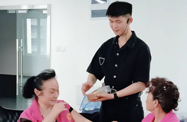 其次,现场制作,护肤授业。叶老师要求志愿者将精油滴入阿姨们的手心一边让其感受香薰精油的奥秘,一边有奖竞答,许诺猜出精油成分的可获得由叶老师亲手制作的护手精油作为奖励。阿姨们斗志昂扬,一个个积极抢答,现场氛围热烈而又芳香四溢。叶老师还带大家体验芳香头疗和芳香面膜。大家在叶超老师的带领下用芳香精油为身边的朋友,做手部按摩放松,舒缓工作中的疲劳!大家在按摩的过程中静静地去感受对方带来的关心和爱护,并且也相互交流工作、生活中的点点滴滴!