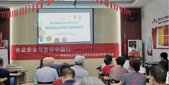 2022年7月5日下午,华中农业大学“食品安全与营养中国行”博士团联同武昌区科学技术协会走进武汉市紫阳街道武泰闸社区红色家园,开展了主题为“疫情下的平衡膳食(老年人系列)”的科普互动讲堂。此次活动由博士团志愿者丁礼贤和李琪琪主讲,正大集团和达能集团赞助,以及三十余位社区居民参与。