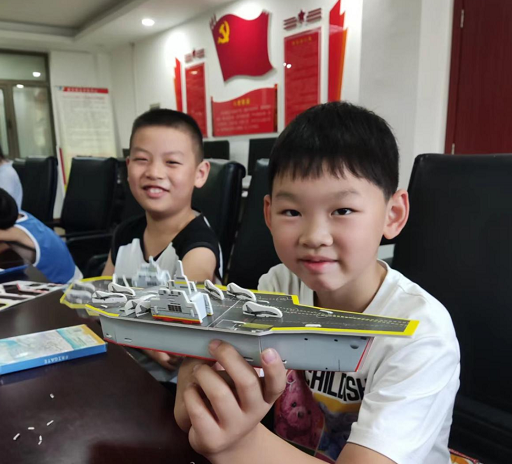 随后,彭老师与志愿者们向社区青少年们分发“航空母舰”模型材料,小朋友们热情激动,在老师的细心指导和志愿者的帮助下,大家互帮互助,最后将“航空母舰”模型成功制作完成,并合影留念。