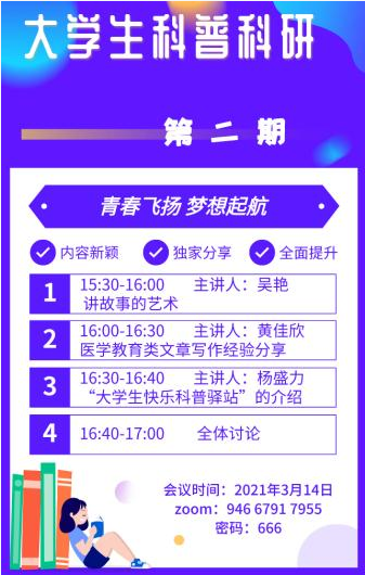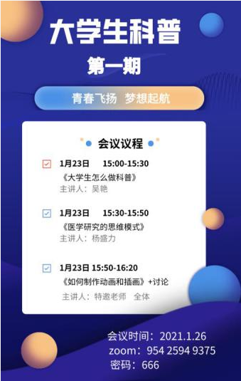 2020年11月21日,在了解了大学生科普意愿和实施医学科普的困难后,杨盛力医生带头组建了“大学生快乐驿站”团队。杨教授对快乐科普驿站的释义是:希望老百姓能够从我们的科普中得到帮助、小伙伴能从科普助人中体验到快乐。团队组建的消息已一经传开,反响热烈,华中科技大学第一临床学院、第二临床学院、基础医学院、护理学院的同学纷纷报名加入,很多外校的老师和同学也踊跃申请加入,截止到目前,团队已有230人。