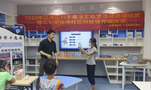 为认真落实党员干部“下基层、察民情、解民忧、暖民心”实践活动部署要求,推动“武汉以我为荣”文明实践活动走实见效,丰富江岸区青少年暑期精神文化生活,提升青少年沟通交流能力,切实推进江岸区青少年科普教育取得实效,8月12日下午,由江岸区科协、二七街道办事处主办,江岸区新时代文明实践志愿服务总队科学普及志愿服务队、魔法启程科技志愿服务队承办的江岸科学魔法实验室活动启动仪式暨操场社区科技馆开馆仪式在操场社区科技馆举行。