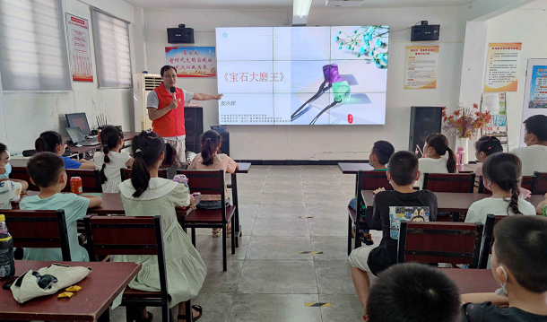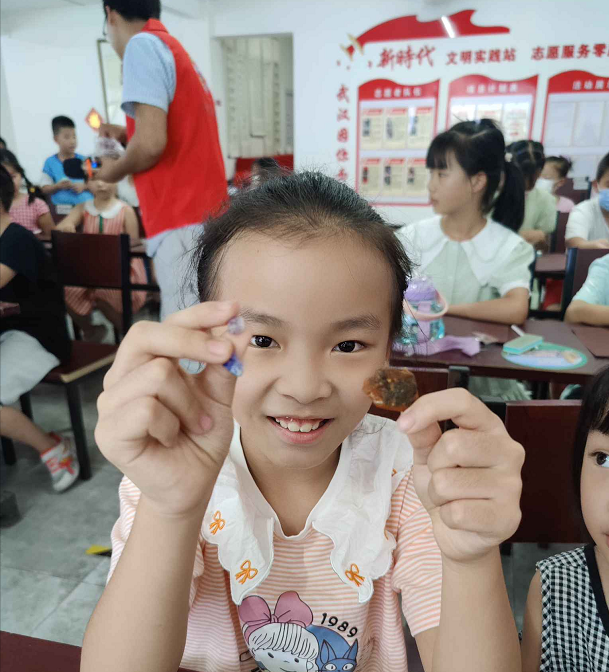 8月15日下午,由江岸区科学技术协会主办、武汉游品慧青少年科普教育服务平台承办的2022年“科创有我,筑梦未来”江岸科学探秘营活动,走进了百步亭社区景兰苑居委会。活动邀请到了中国地质大学(武汉)逸夫博物馆高级研学讲师殷永辉老师为现场的四十多位小营员授课,志愿者老师以《宝石大磨王》为题,带领营员们了解有关宝石的知识。为了调动大家的积极性,课程采取有奖竞答的方式进行,让营员们认识宝石,了解宝石形成的方式、辨别宝石的真假和明白宝石的价值。