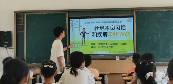 实践队在湖北、云南两省多地开展了社会影响力强、群众参与度高的线下、线上实践活动。以云调研、云课堂、实走访等形式,在云南省临沧市临翔区蚂蚁堆乡蚂蚁堆完小、随州县长岗镇中心学校、洪山镇小学、谷城县甘坪中心小学、钟祥市丰乐镇丰乐小学、崇阳县天城镇鹿门铺村崇阳第二实验小学、建始县茅田乡茅田小学、武汉市黄陂区龙潭青少年空间、湖北省孝感市大悟县金岭村等十多家学校联合华中科技大学各大支教队开展了科普进校园之“杜绝不良习惯,和疾病Say No”的专项健康讲座活动。为千余名中小学生送去了暑期“科普大餐”。