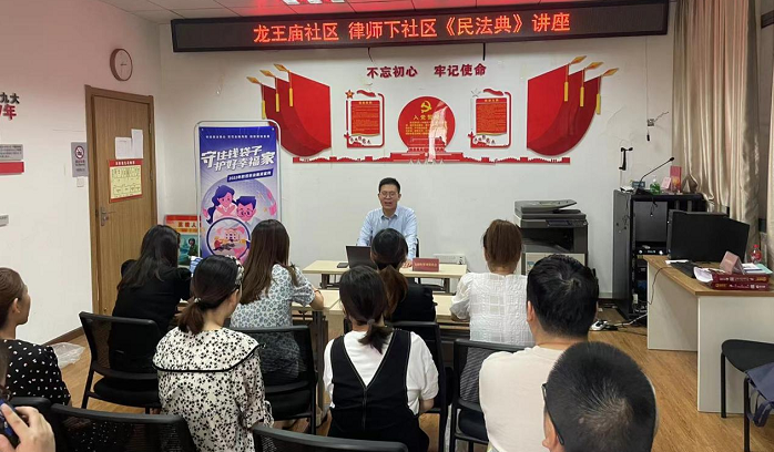 为深入学习宣传贯彻习近平法治思想,贯彻落实“八五”普法规划精神,2022年8月25日,江汉区科学技术协会、武汉金融街管理委员会、武汉众和法律服务中心以《民法典》作为普法重要内容,在民族街道龙王庙社区举办“民法典宣讲进社区 普法惠民润民心”公益普法活动,辖区物业公司代表、社区工作人员、社区居民等数十人参加活动。