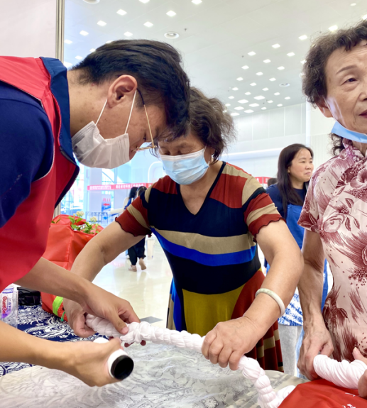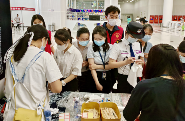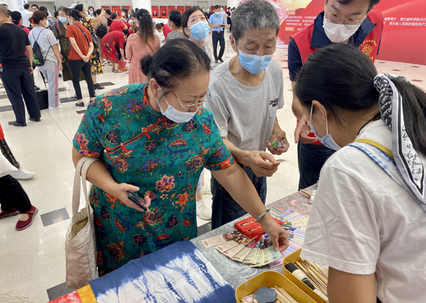 活动现场,民族学博物馆志愿者队伍带来了扎染工艺品和扎染体验。扎染是中国民间传统而独特的染色工艺,分为扎结和染色两部分。它是通过纱、线、绳等工具,对织物进行扎、缝、缚、缀、夹等多种形式组合后进行染色,最终形成各种形状的花纹。扎染工艺品一经展出便吸引了大量游客驻足欣赏,大家纷纷惊叹民族传统手工艺技术的精湛与神奇。