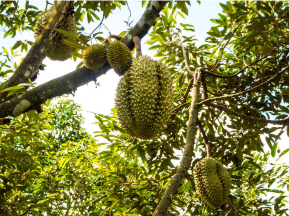 榴莲属于纯热带作物,要终年高温的气候才能生长结实,榴莲大如足球,外皮粗糙不平,很多细小的枝干也能承受起这样的重量还是让人十分意外的。