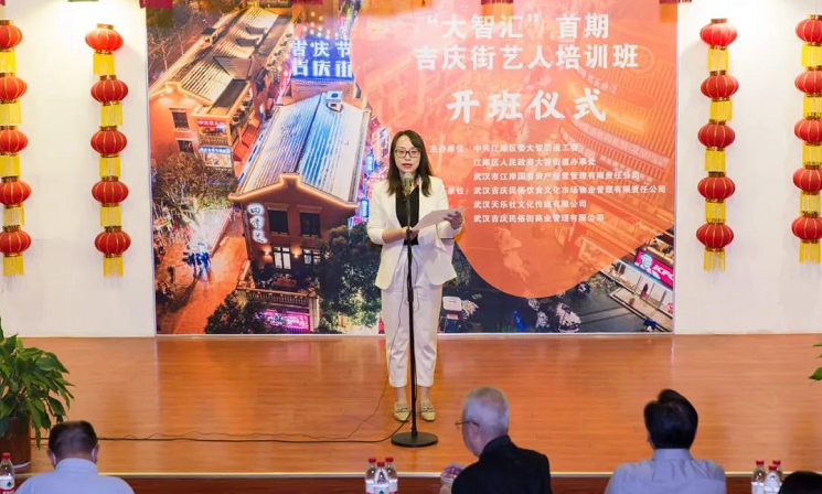 大智街道办事处主任罗颂华在开幕式上作了热情洋溢的致辞。她表示:吉庆街是武汉的百年老街,既有“老汉口”的古韵历史文化沉淀,又有现代商业的市井繁华民俗风情。经过多年的发展,吉庆街深度融合美食文化和民俗文化,成为领略武汉地域风情的窗口和地标。吉庆科普艺人团是社会的宝贵财富,对传承文化起到举足轻重的作用,各位艺人要坚持高尚的职业操守,养心修身、德艺双馨,要珍惜此次机会,潜心笃志、锤炼精品,将百年老武汉的历史文化传承好、发展好、保护好!谈到江岸区文化和旅游资源时又表示:文化是城市的灵魂,文化兴则城市兴。江岸区作为老汉口的核心区域,有着中组部旧址、瞿秋白纪念馆、八七会议会址纪念馆等丰富的红色文化资源。目前全区正加紧建设汉口历史文化风貌区,随着老里弄的改造、市政基础设施的提升,我区的文化旅游事业必将蓬勃发展。