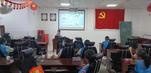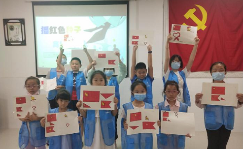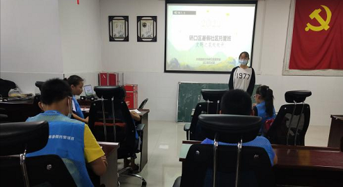 汉口春天社区工作人员为辖区青少年安排了丰富的课程,第一节课主题为“童心向党”,是为加强青少年童心向党的理想信念。由社区工作人员向青少年介绍优秀少先队员英雄事迹事迹,教育青少年学习雷锋精神。并且播放视频,讲述少先队的基本信息,包括队徽、队旗、红领巾的用法及意义,最后由孩子们绘画出队徽、队旗和红领巾。
