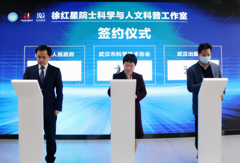 揭牌仪式上,党组成员、副主席郑华,江岸区委常委、常务副区长熊俊,武汉出版集团党委副书记、总经理王卫东签署徐红星院士科学与人文科普工作室共建协议。