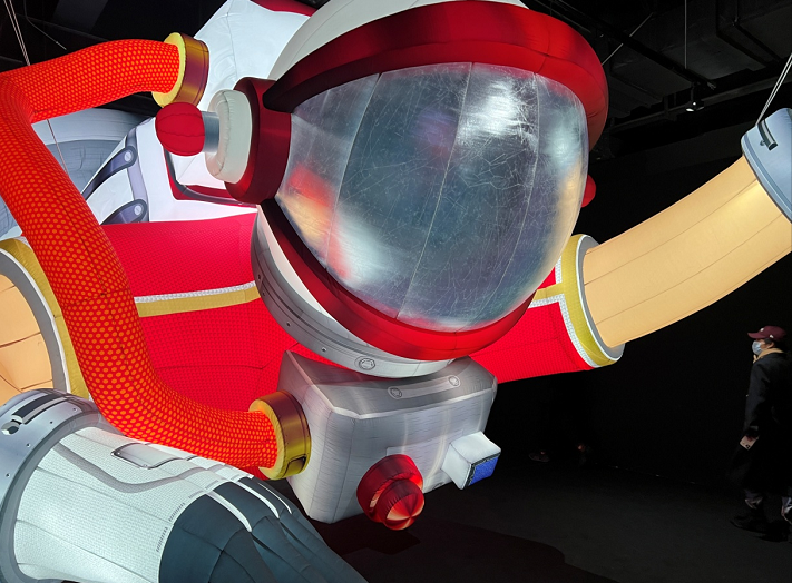 刚刚进入《漫无边界》航天艺术展区,就与一位“巨型航天员”不期而遇。这是一个特制的航天员模型,带领居民进入浩渺的宇宙星空。在展区内,先后感受了火箭点火升空的过程、嫦娥五号返回舱、天问一号着陆器等的全真模拟场景,体验了超维度虫洞空间、宇宙空间站还原的奇妙感受。现场不时有居民发出惊奇地感叹。