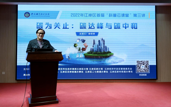 为了更好地让民众了解碳达峰、碳中和“双碳”目标,切实提高民众的节能减排意识,12月9日上午10点,2022年江岸区首届“科普云课堂”第三讲正式开讲,此次科普云课堂特邀国家自然资源首席科学传播专家、中国科协“科普中国”专家团成员徐世球作为主讲嘉宾。以《碳为关止:碳达峰与碳中和》为题,徐世球从一“碳”究竟、双“碳”目标、三“碳”责任三个方面,生动地介绍了碳排放的产生及危害,碳达峰与碳中和的科学内涵及实现途径等内容,多维度分析实现碳中和的重要意义,为大家带来了一场精彩的科普盛宴。