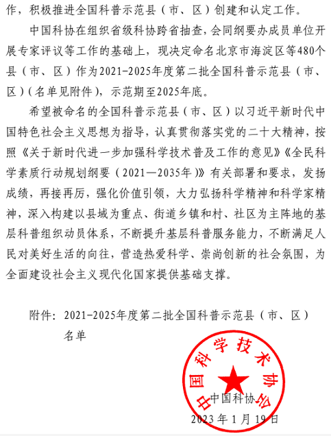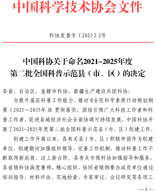 1月19日,中国科协发布《关于命名2021-2025年度第二批全国科普示范县(市、区)的决定》(科协发普字〔2023〕2号),武昌区榜上有名,成功创建“全国科普示范区”,这是自1998年以来,武昌区连续第六次获得命名。