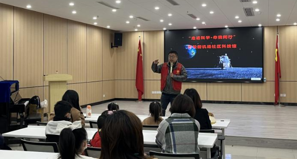 活动开始,谢老师通过PPT及视频影像为孩子们介绍王家墩机场的前世今生历史故事,及抗日战争时期空战英雄“陈怀民”的英勇事迹,并向社区青少年儿童科普“嫦娥携手玉兔探月”、“玉兔载土归来”、长征五号运载火箭等航天知识。