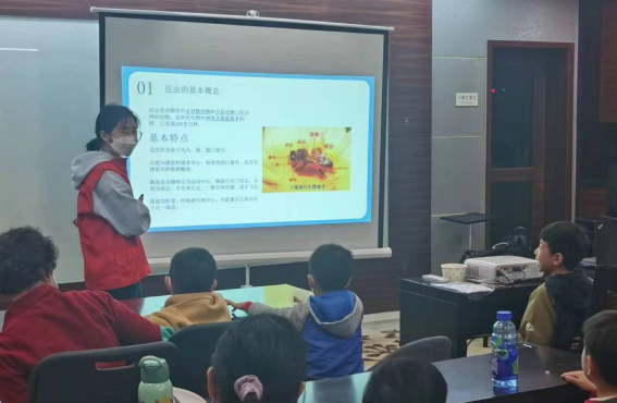 现场,志愿者老师用PPT为在场的青少年简单介绍了昆虫的基本概念,通过图文并茂的形式让小朋友们详细了解昆虫的种类、生活习性等。讲解中老师还通过互动问答的方式引导小朋友们主动思考,答对的小朋友还有矿石作为奖励。