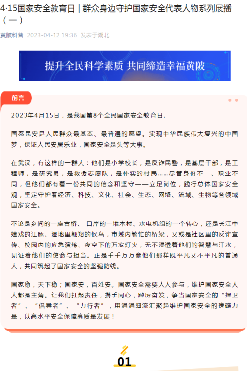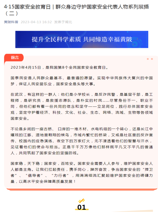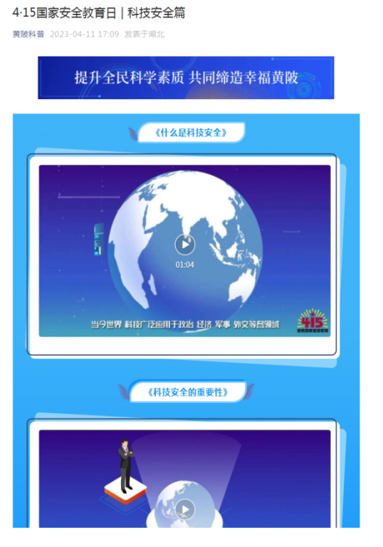 4月10日至4月17日期间,区科协还充分利用全媒体科普视窗、“黄陂科普”微信公众号等载体,播放国家安全宣传海报、视频、标语等内容,着力增强全民国家安全意识,推动大安全理念深入人心。