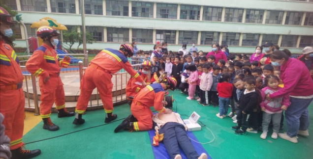 随着“灾害危机”全面的解除,在应急志愿者和老师们的引导下,学生们围成小圈听中韩石化消防应急中心的队员及医护人员为学生们讲解“防灾减灾”相关知识及应急救治小常识,并且详细地演示和讲解了“心肺复苏”急救操作和“海姆立克”急救法。伴随着应急疏散及防灾减灾知识普及宣讲演示结束,幼儿园全体师生纷纷鼓掌,报以热烈的掌声。