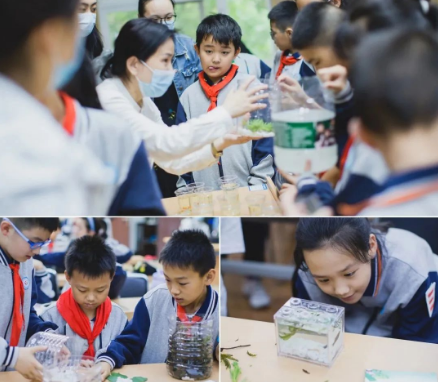 老师带着大家采集了水草与石子,来到室内准备制作水生生态瓶。王宁迪讲解了生态系统相关知识,强调一个良好的生态系统一定是生物与生物、生物与环境之间相互影响、相互制约,并相对稳定的动态平衡状态。孩子们兴致高昂,动手实践,将水草、砂石、水、小鱼等元素一一放入,打造自己的专属生态瓶。兴之所至,更是奏乐高歌,合唱起了荷塘版《挖呀挖》,欢乐的旋律跃动在每一个人心尖。