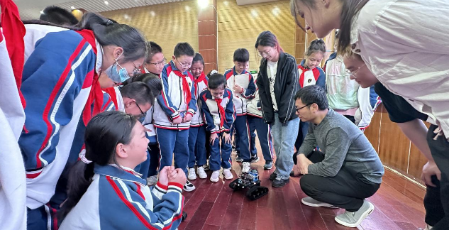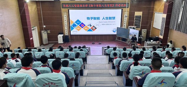 在讲到人工智能与人工智能教育之间的关系时,马老师强调了人工智能在当今社会的重要性和广泛应用。他向学生们普及了人工智能的基本概念、技术原理和应用场景,让学生们深入了解到人工智能不仅是一种技术手段,更是一种变革和创新的力量。通过讲解人工智能的发展历程和前景,马老师鼓励学生们积极探索和学习人工智能相关知识,为未来的职业发展做好充分准备。他还分享了一些人工智能领域的成功案例,启发学生们思考如何将人工智能应用到实际生活中,为社会创造更多的价值。在讲座中,老师还为同学们现场实操了如何手动、语音控制智能机器人,现场同学们纷纷上台跃跃欲试,整个讲座中,学生们认真聆听,兴致盎然,现场气氛热烈!通过这次讲座,马老师成功地培养了学生们对人工智能的兴趣和热情,为他们的未来探索之路提供了重要的参考和指导。