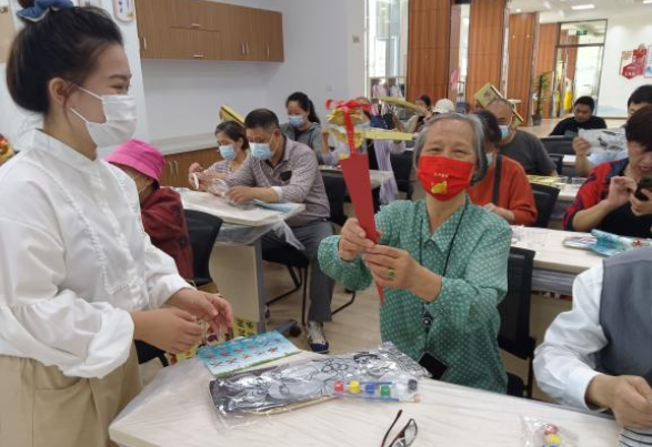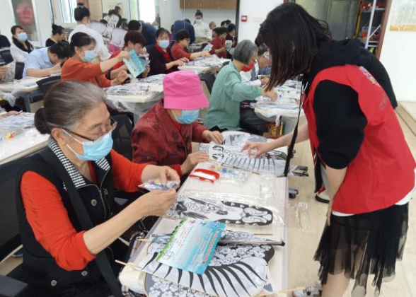 志愿者们提供了画笔、装饰物和工具,讲解我们此次风筝涂色的方法以及组装的重难点。然后居民在志愿者的指导下亲手制作自己的纸鸢。工作台上充满了创意和想象力,各种形状、颜色的纸鸢逐渐在众人的手中成形。“你的是花开富贵,我这个是蝶恋花,前面还有一只鱼跃龙门,细节上面不一样哦!”居民积极交流、互相帮助,共同创作出一只只独特的纸鸢。更有迫不及待地居民牵着风筝线绕指试飞了一圈。