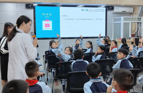 课堂上,武汉爱尔眼科医院小儿眼科彭婷医生从基础眼部的结构讲起,通过多媒体展示出近视的原理,帮助现场的青少年儿童理解什么是近视,引来了现场孩子们阵阵思考。同时采用互动问答,四人小组讨论的方式,引导孩子们养成良好的用眼习惯,呵护好心灵的窗户,孩子们积极参与问答,争当用眼知识小能手。