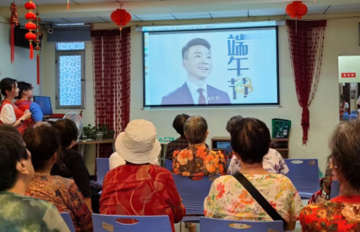 首先志愿者开门见山点明今日活动主题——志愿情义暖端午,智能养老我先行,通过提问老年人往年端午节的日常活动活跃现场气氛,并借此引入对本次活动各环节的简单介绍,让老人形成初步印象。接下来,志愿者先通过文字讲解帮助老年人回顾端午节来源与习俗,再通过播放视频“康辉说端午”解析古今端午节文化内涵的异同,老年人对于理解视频中运用的诗句略有难度,但其中提到的文化常识让老人们迫不及待相互展开交流。