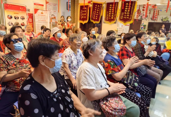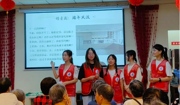 之后活动进入表演环节,五名志愿者先行展示了情景剧——端午风波,剧情中通过女儿“小张”在“王奶奶”和“李叔”的帮助下向母亲“张奶奶”送礼机器人保安“小智”、燃气报警器、水浸探测器与智能手环的情节,表演端午节小贴士,向老年人介绍智能养老服务如何帮助老人规避日常居家场景中可能存在的安全问题、提高老年人生活质量,接下来,两名志愿者上台表演歌曲《挖呀挖呀挖——智能养老版》,老年人为其击掌打节拍,在老年人的热烈反响下,全体志愿者一起将歌曲进行了第二次表演,现场气氛达到高潮。