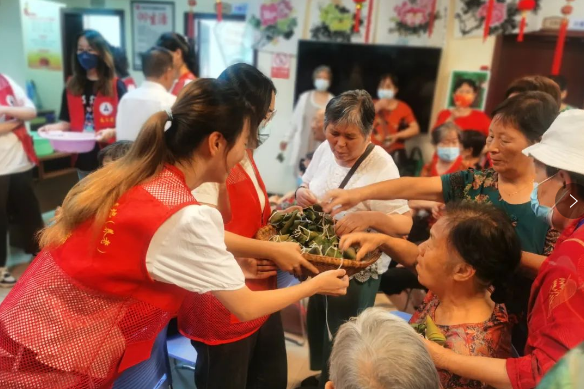 最终本次志愿活动以榴锦年年照眼明环节收尾,志愿者向老人分发制作好的角粽与预先备好的咸蛋,老人们十分偏爱牛角形状的粽子,全体成员一起合影结束了本次活动。