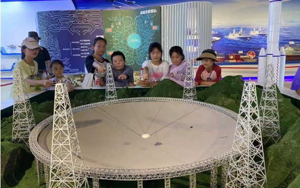 “快看快看,战斗机!”“哇,太酷了!”才刚到展览馆大门口就被矗立在展览大门左侧的战斗机模型所吸引,兴奋之情溢于言表,孩子们在欢声笑语中给拉开了今天夏令营的帷幕。