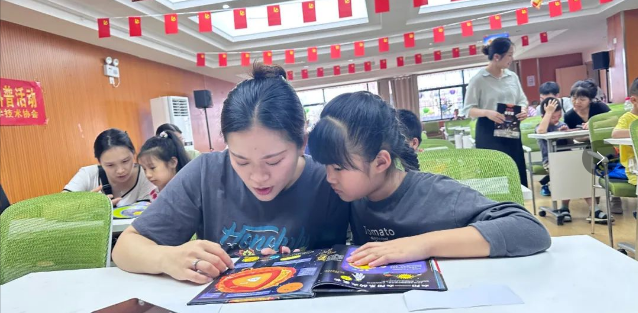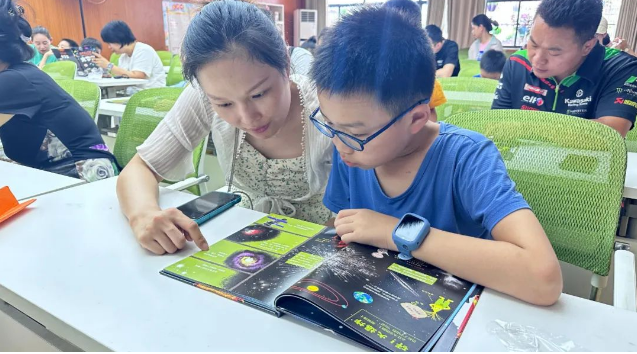 活动开始,老师为在座的同学们分发了宇宙科普书籍,并引导他们与妈妈们一同阅读了书本片段。这本书蕴含丰富的宇宙原理科普内容,教室里瞬间响起了朗朗的读书声,同学们都在为之后的知识问答做好准备。