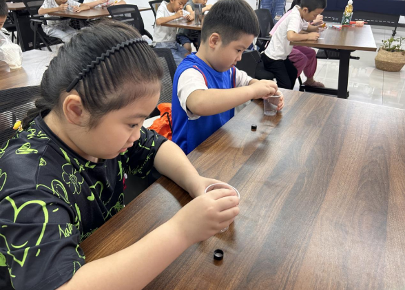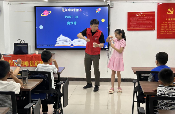 活动伊始,近20名青少年齐聚社区新时代文明实践站,科技志愿者老师为同学们带来了精彩的魔术热场秀,老师以神奇的魔术效果“清水一点一点变冰块”为引子,激发孩子们的好奇心和求知欲。利用孩子们对魔术奥秘的追求,引导他们主动思考,深入探究魔术背后的科学原理。通过“点水成冰”魔术,青少年们将了解到使用高分子吸水性树脂可以将水吸收并形成凝胶状的原理,即使加压也难以挤出水来。