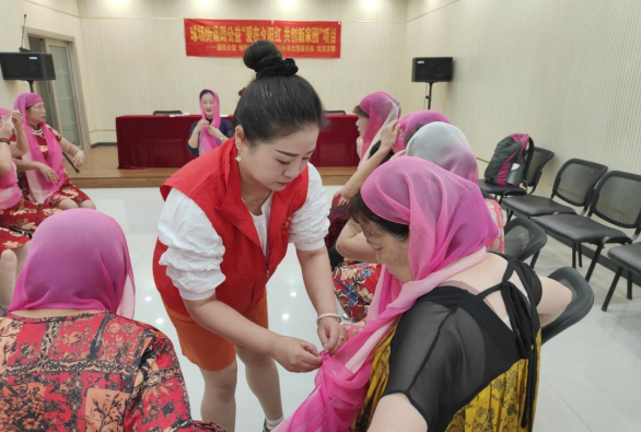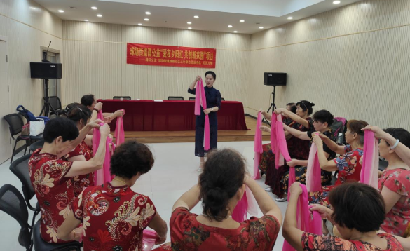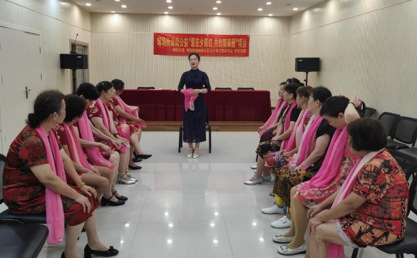 在赖老师的引领下,每个人30秒的自我介绍拉开了本次活动的序幕。活动中,赖老师从旗袍文化的由来、穿旗袍的仪态、走路的姿势、旗袍走秀的技巧等方面对大家进行了一一讲解,并不断与阿姨们互动,活跃现场气氛。她还指导阿姨们在走秀时要注意身体重心,两腿支撑时要有转换技巧,唯有如此,才能走出温婉动人、亭亭玉立之感。另外,赖老师还特别教大家几款适合旗袍穿搭、日常穿搭的丝巾系法,阿姨们在赖老师的细心指导下反复练习。到了最为精彩的走秀环节,阿姨们一转身一回头,一颦一笑一挥巾,宛如古典之花,将东方女性贤淑、优雅、高贵的独特气质展现得淋漓尽致,都变成了自信从容、楚楚动人的“国风女神”。