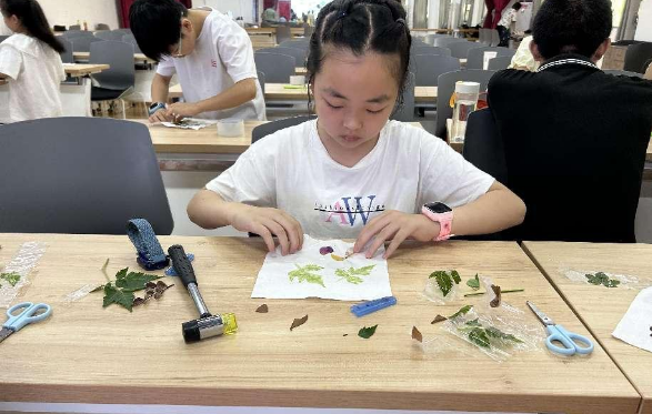 孩子们听得津津有味,带着好奇和疑问,他们跟着志愿者在接下来的制作环节中,更是聚精会神、脑洞大开,充分发挥自己的想象力和动手能力。他们将志愿者提前采摘好的花草树叶,通过敲捶、捆绑、包扎、侵染等方式,让布料充分吸收植物染液形成不同图案,变成一幅幅自然灵动的作品。