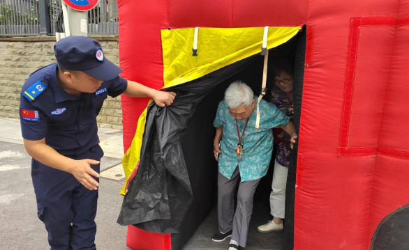 学会了互救,那如何自救?这是刘老师的第二个问题。针对这个问题,他结合火灾现场中的救援实例以及火灾逃生模拟让大家了解和亲身感受火灾现场,并运用正确的方法去尽可能地逃离危险的环境。在火灾模拟现场,老师为大家示范了灭火器、防烟雾面罩的正确使用方法之后,逃生情景模拟开始了!在场的30位居民在刘老师的带领下,有条不紊地“逃离”烟雾现场,从“逃生通道”入口进去,在黑暗中不断摸索,30位居民最终成功逃离火灾现场,从出口出来。“第一次体验消防逃生帐篷,里面很黑,啥都看不见,又新奇又紧张,但是我对火灾逃生现场有了进一步直观地了解。”社区居民王女士这样说。