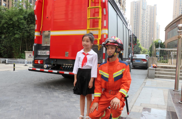 当社区应急救援力量扑灭火情的同时,江岸区消防救援大队百步亭救援站专业消防员和江岸区宝捷应急救援队的社会救援力量及时赶到现场。火情被控制住后,为了安全救出驾驶员,消防员们经过现场研判,决定从道具车辆的副驾驶位置车门处进行破拆操作,发动液压机动泵,连接液压剪扩器,当一名队员用手动撬棍把门撬开一定间隙后,使用液压剪扩器将车门破拆打开,时间仅仅只用了一分钟左右。这时,江岸区宝捷应急救援队的队员们配合消防员对伤员进行院前简单救护处理,然后将伤员转运到救护车上转运去医院,此时现场观摩的“红领巾小小应急宣传员”和家长爆发出热烈的掌声。
