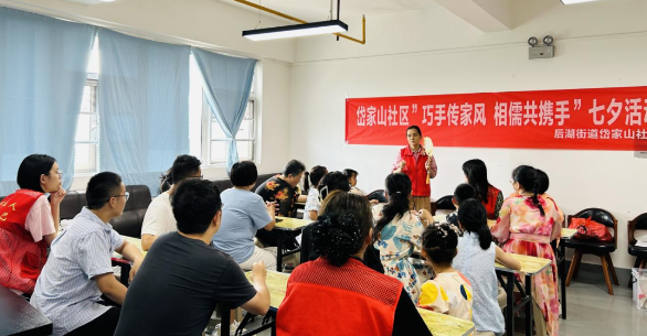 为弘扬中华民族优秀传统文化,讴歌美丽真情,传承良好家风家训,树敬老爱老新风,培植社会主义核心价值观,近日,后湖街道岱家山社区组织辖区内部分家庭开展“巧手传家风 相儒共携手”七夕活动,倡导居民树立良好的家庭文明新风尚,在经营好小家庭的同时,共同维护好文明幸福的社区大家庭。