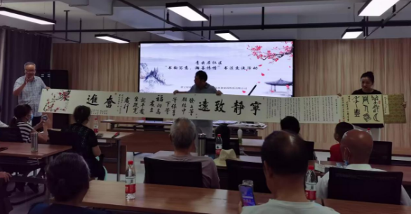本次书法科普交流活动特邀请书法老师段奇洲先生给辖区老人做分享。段老师来到讲台前,生动地为现场的老年书法爱好者们讲述书法的历史起源和发展,随后又进行了书法知识竞答,现场气氛紧张而热烈,老年朋友们不时发出惊叹和掌声。