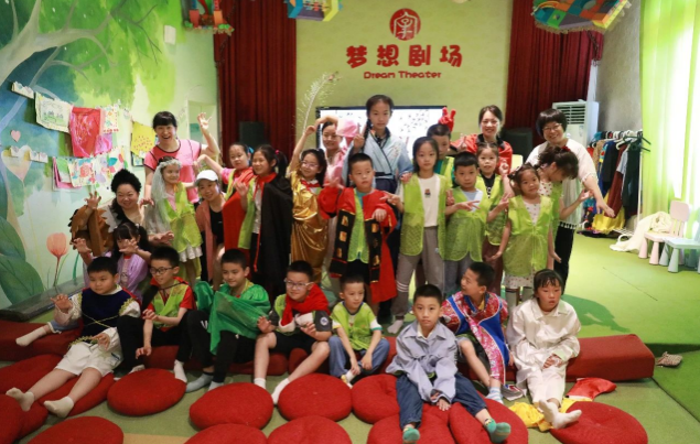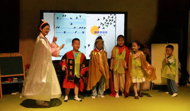 分享完绘本故事后,在四位志愿老师的带领下,孩子们分为4组,开展小组活动、编排小组表演节目。小组节目展示环节,神秘奇特的蜘蛛蟹们表演了蜕壳和集体防御姿态——抱团垒成金字塔;高雅温柔的火烈鸟们再现了其举办宴会的场景,有街舞、芭蕾的舞蹈环节,有动物模仿秀环节,有歌唱环节——唱的是“2022年度儿童经典曲目”《孤勇者》,引发全场所有“群居小动物”们大合唱;活泼有力的帝企鹅们表演了下海捕猎、集体带娃的场景,憨态可掬的步伐,引得大家哈哈笑不停;志愿者狼妈妈带领的6只小狼崽崽压轴登场了,他们自称“七匹狼”,在演绎了集体狩猎场景后,狼妈妈突然发出一声短促嚎叫,6匹狼崽崽集体冲入观众席,成功捕获一只蜘蛛蟹。通过模仿扮演群居小动物这一新颖的活动形式,团结协作,寓教于乐。