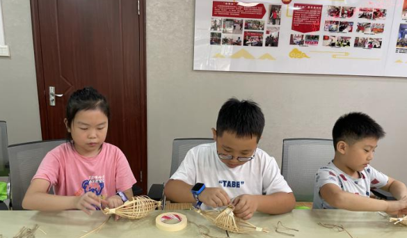 活动现场,指导老师用基本的竹编编织技艺,不同的编织手法,让孩子们感受“跳跃在指尖的竹编艺术”。从最基本的编织技法入手,学习制作竹编小托盘、小舟。在“一压一挑”上下翻飞之间,在“一经一纬”纵横交错之中培养大家良好的观察能力、模仿能力、独立动手能力。孩子们跟着指导老师的步伐,分层、编织、锁口......对这些在书本上从来没接触到的知识,同学们展现出极大的热情和兴趣,都忍不住跃跃欲试。