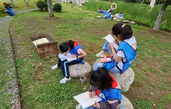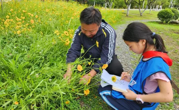 “它的花朵好像光明四射的太阳呀!”聆听着导师的介绍,同学们对金鸡菊有了更深的认识,纷纷拿起纸笔将自己所观所得记录下来,完成了一份属于自己的自然日记。