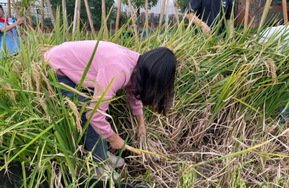 随后,专家领导们来到“五谷景苑”粮食基地,基地中同学们在老师的带领下有的在收割水稻,有的在给水稻脱粒,俨然化身为一个个“小农夫”脸上洋溢着丰收的喜悦。