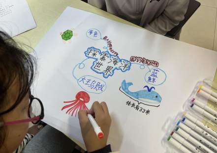 在充分学习了解海洋文化知识后,孩子们发散思维将所学所感进行全面回顾并概括浓缩成精华,用思维导图的方式记录下来,找到知识点之间的关系、加深学习印象。