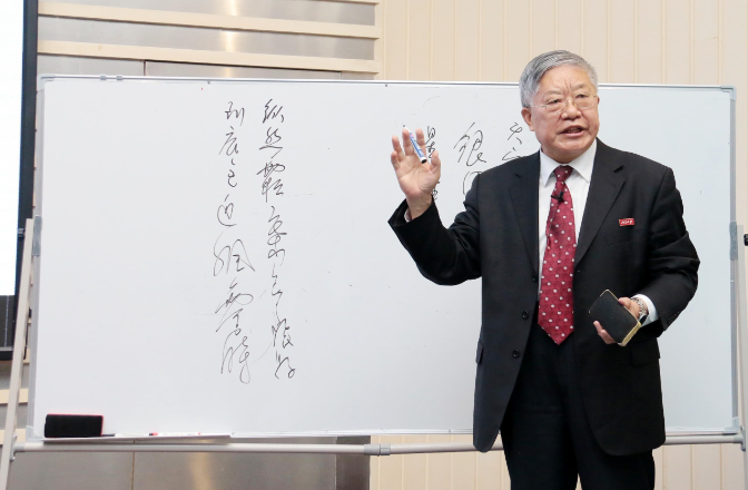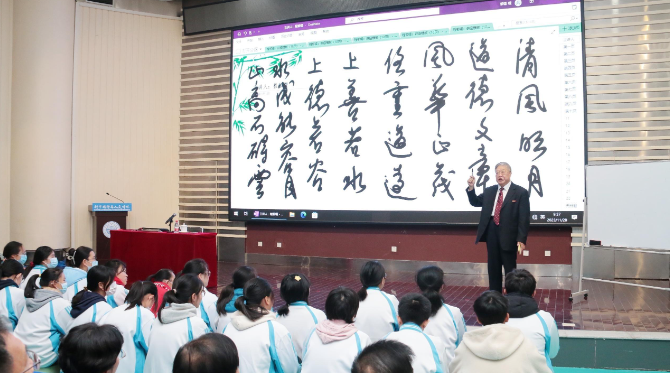 在300余名听众的热烈掌声中,北京大学中文系教授、博士生导师程郁缀走上讲台,开始了一场关于“古典诗词与人文情怀”的首场讲座。整场报告程郁缀教授边讲边写,一手汉字苍劲有力,一口略带江苏口音的普通话,串起了诗经,楚辞,建安诗,唐诗,宋词,怀乡诗中的经典作品,真切自然之中不乏幽默诙谐,将中国诗歌的千年脉络娓娓道来。