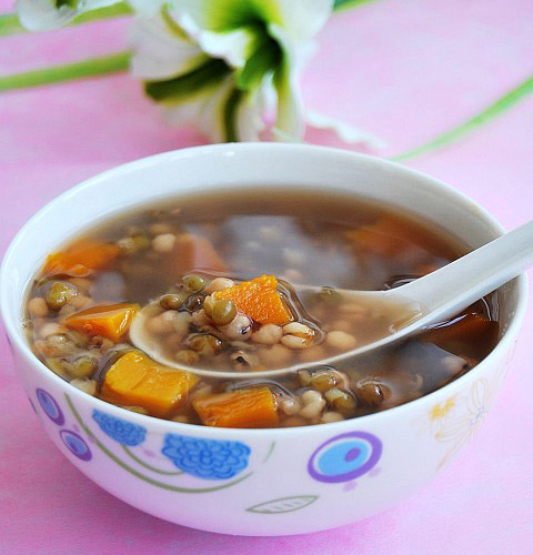 2、绿豆南瓜汤:绿豆50克,老南瓜500克,食盐少许。绿豆清水洗净,趁水汽未干时加入食盐少许(3克左右)搅拌均匀,腌制几分钟后,用清水冲洗干净。南瓜去皮、瓤用清水洗净,切成2厘米见方的块待用。锅内加水500毫升,烧开后,先下绿豆煮沸2分钟,淋入少许凉水,再煮沸,将南瓜入锅,盖上锅盖,用文火煮沸约30分钟,至绿豆开花,加入少许食盐调味即可。