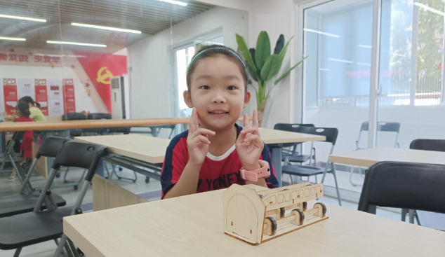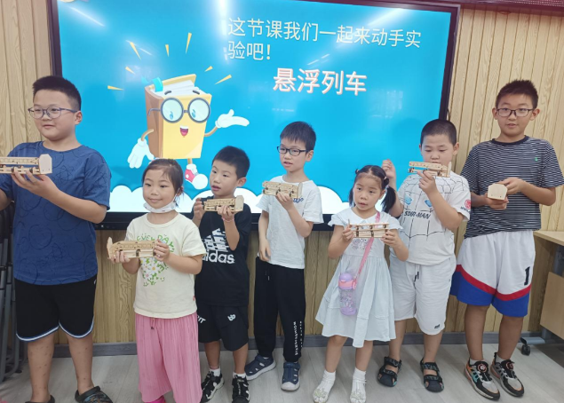 最后到了自制悬浮列车的手工环节,老师给大家示范步骤。接着派发道具,同学们拿到材料包,高兴地手舞足蹈,兴奋地把木片和磁石固定在轨道上,做好轨道,再把列车组装好,列车和轨道相斥,自然就悬浮起来了。坐在后排的大哥哥动作最快,其他同学还在组装,同学们看到他拿到前面展示的他的列车,全班异口同声惊叹,悬浮的列车太酷了!大家争相加快速度,有些零部件穿不过去的主动求助老师和同学。经过同学们的精心制作,悬浮列车陆续出现在家长们的眼前,家长们纷纷称赞不已。