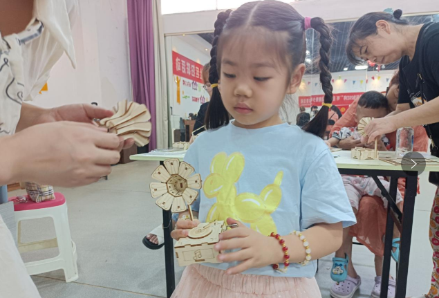 开始动手操作了,小朋友们对留声机的拼接很感兴趣,都在积极动手。有的独立操作,有的在家长的陪伴下,小朋友们都非常自觉,遇到问题了也会向老师求助。