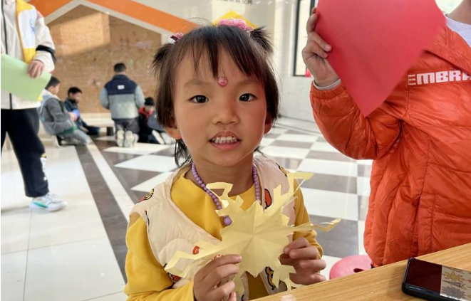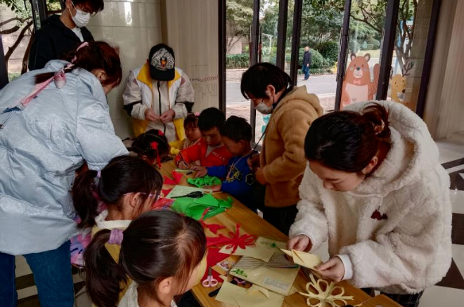“姐姐你看,我的雪花是圆圆的,她的是菱形耶,大家的雪花都好漂亮呀!”做完手工的小朋友激动地和志愿者分享着自己的想法。