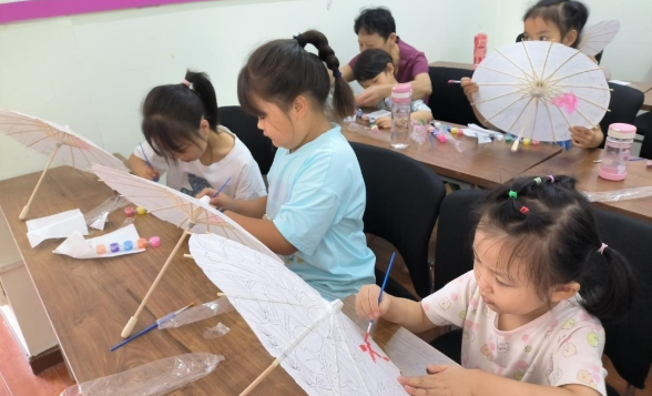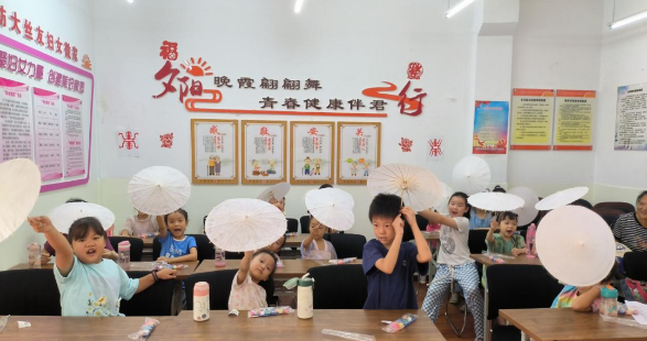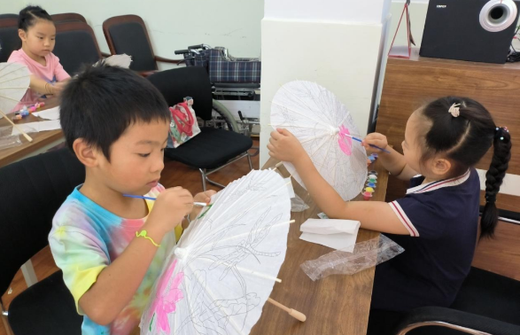 学习完中华传统清廉相关知识文化后,社区老师配合社会道德法制老师为孩子们分发“清廉油纸伞”材料包,孩子们在老师的指导下拿起手中的画笔,在油纸伞上细细描摹荷花、兰花、翠竹、莲花等廉洁文化元素,把自己对廉洁的理解与诠释充分展现于“伞”上。