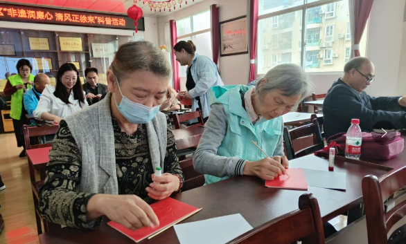 随后,居民们在老师的指导下体验了拓印流程。他们在认真地在模板上刻下喜欢的图案,涂抹墨汁,按压均匀,在纸上进行拓印。看到自己亲手制作的一幅幅拓印成品跃然纸上,都露出了满意的笑容。